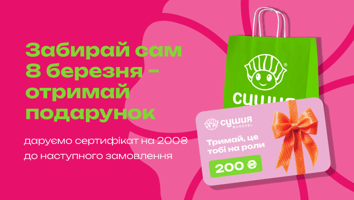 🎁 Сертифікатом на 200₴ можна сплатити будь-які страви з меню Сушия (окрім алкогольних напоїв) при наступному замовленні