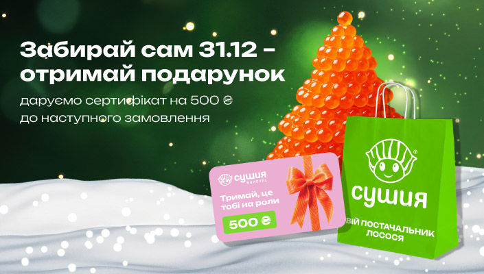 🎁 Сертифікатом на 500₴ можна сплатити будь-які страви з меню Сушия (окрім алкогольних напоїв) при наступному замовленні