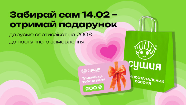 Planning to celebrate a Valentine's day with a loved one? Order a pickup on February 14, pick up your order at a convenient time on your way home or while visiting, and be guaranteed to receive a gift of 200₴ for your next order.