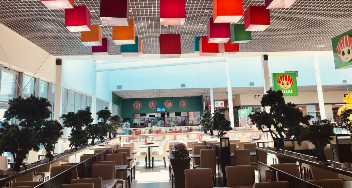 Інтер'єр закладу оформлений в традиційному для мережі ресторанів Сушия стилі, переважають яскрава помаранчева і спокійна зелена кольорова гамма. По залу стоять зручні м'які крісла та дивани, де можна добре відпочити після виснажливого шопінгу. Також в закладі великі панорамні вікна, з яких добре видно автомобільну парковку: гості можуть постійно спостерігати за своїм особистим транспортом.